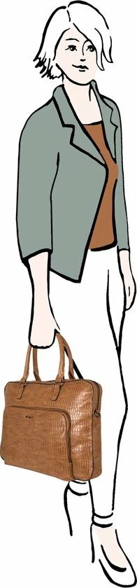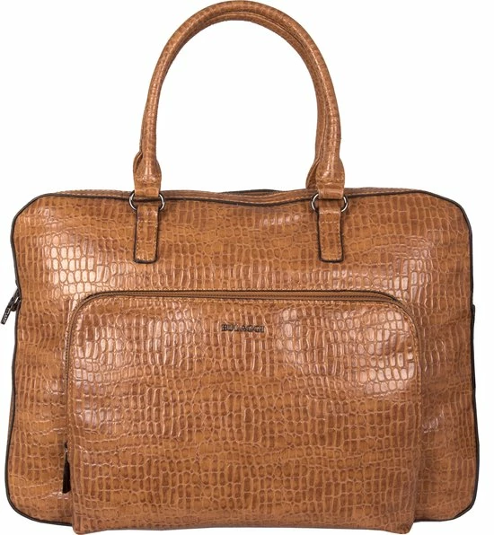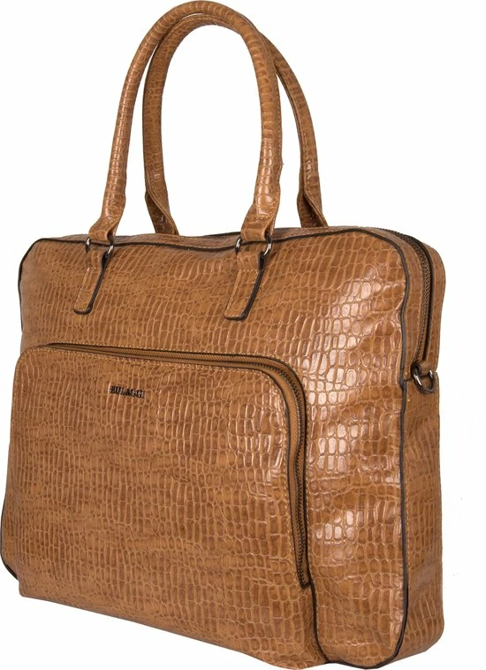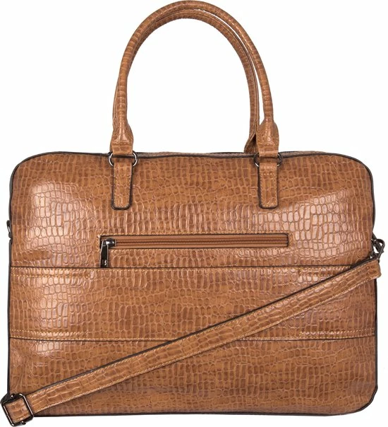 Deze elegante cognac laptoptas Irene, is goed te combineren met verschillende outfits vanwege de neutrale kleur. De croco print van de laptoptas geeft de zakelijke tas net wat extra’s. Deze tas wordt geleverd met een verstelbare schouderriem, zodat je de tas niet alleen in de hand hoeft te dragen. Bij deze tas zit een extra schouderriem, zodat de tas ook comfortabel over de schouder gedragen kan worden. Aan de binnenkant heeft deze tas drie hoofdcompartimenten gescheiden door een compartiment met rits in het midden. Dit middelste compartiment heeft twee steekvakjes en een ritsvakje. De twee overige compartimenten sluiten met een magneetsluiting. Aan de voorzijde van deze tas bevindt zich een additioneel vakje. De tas wordt gesloten met een rits. De metaalkleur is zilver. De afmetingen (breedte / hoogte / diepte) van deze handtas zijn 43x32x9 – 17 cm