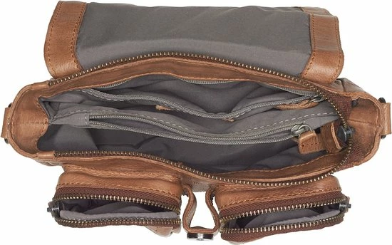 De binnenkant bestaat uit 3 hoofdvakken waarvan de middelste afsluitbaar is d.m.v. een rits. Het achterste vak heeft nog een extra zijvak met rits.