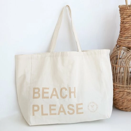 Let’s go to the beach! Deze beige canvas strandtas met de tekst BEACH PLEASE is ideaal voor een stranddagje in eigen land of op vakantie.