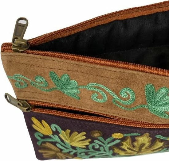 Dames polstas gemaakt van suède leer met handgeborduurd hennepplant patroon. Deze unieke polstas is verfraaid met prachtige handborduurwerk in Kashmir design. Het is een stijlvolle tas voor dagelijkse gebruik, perfecte maat voor je telefoon, make up, paspoort en geld. Gebruik deze multifunctionele tas om je handtas te organiseren of op reis. Tas is voorzien van een ruime ritsvak en twee zij ritsvakken.