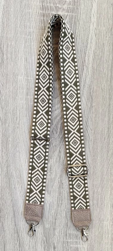 De band heeft een geweldig leuk geweven patroon en de zilver kleurige sluitingen zitten bevestigd d.m.v. een strookje imitatieleer. De schouderband is in meerder kleuren verkrijgbaar.