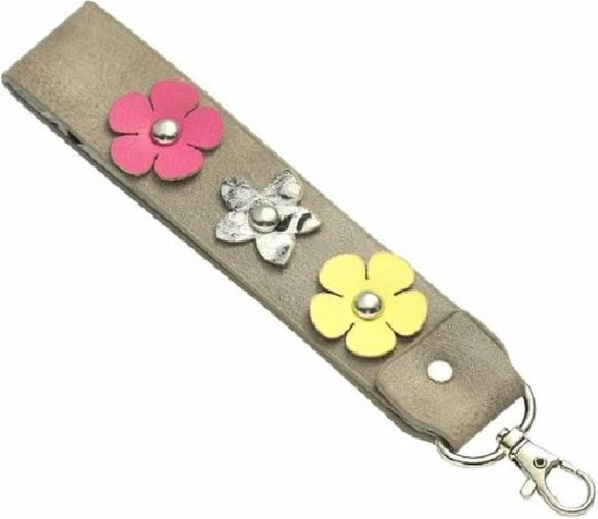 Een fleurige en vrolijke kunstleren sleutelhanger-tassenhanger die natuurlijk ook gebruikt kan worden als hanger aan de portemonnee of sleutelbos. De binnenkant heeft een leuke print en de buitenkant is voorzien van fleurige bloemen. Voor uzelf of Bestel Een Kado.
