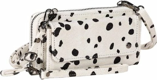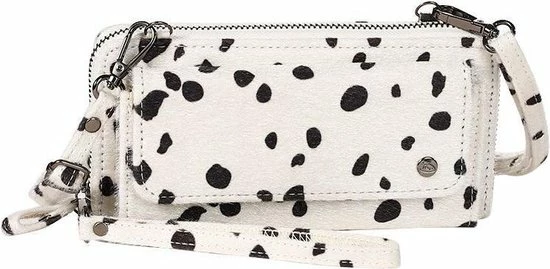 Moderne, stijlvolle dames portemonnee Key West is weer een pareltje tussen de portemonnees. De portemonnee is uniek dankzij het vrolijke dalmatiΓ«r printje en het vachtje.De klassieke portemonnee wordt geleverd met een afneembare pols en schouderband. Key West is uitgevoerd in een hoogwaardig veganistisch leer en voorzien van een zacht vachtje. Deze portemonnee bevat een ruim voorvak geschikt voor verschillende I Phone of Samsung telefoons. Indeling binnenzijde: 3 grote vakken, een vakje met rits voor kleingeld en diverse insteekvakjes voor pasjes. De portemonnee wordt geleverd met hengsel en polsbandje. Deze ook-leuk portemonnee is een praktische en modieuze aanwinst voor uw accessoires!Details:Kleur: Zwart witMateriaal: Veganistisch leerAfmeting: 20cm x 10cm x 5cmAfmetingen van het voorvak: 17cm x 8cm
