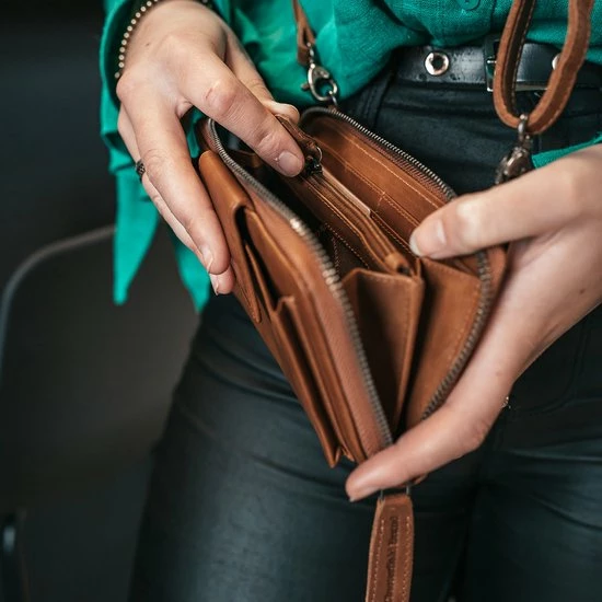 Is jouw smartphone je number one essential? Neem jij deze overal mee naartoe en wil je βm altijd binnen handbereik hebben? Dan is de leren telefoontas Taipei echt iets voor jou! Door zβn handige formaat en de mogelijkheid om deze tas op twee manieren te dragen, is dit de nieuwe favoriet van jou Γ©n je telefoon! Deze telefoontas bestaat uit een portemonnee gedeelte waar je 16 pasjes in kunt opbergen en met verschillende vakken voor munt- en briefgeld. Aan de voorkant bevindt zich een extra vak waar je een smartphone ik kan opbergen. Dit vak heeft de volgende afmetingen: 16cm X 8cm. De tas wordt geleverd met een afneembare schouderband waardoor je de tas ook als handtas kunt gebruiken. Deze leren telefoontas is gemaakt van hoogwaardig Wax Pull-up leer. Wax Pull-up leer wordt gekenmerkt door een zachte en soepele structuur. Eventuele gebruikssporen kun je makkelijk wegwrijven door de speciale behandeling die de tas heeft ondergaan. Zo gaat jouw tas jarenlang mee! Ook berg je de tas veilig en stofvrij op in onze meegeleverde dustbag. Deze tas onderhoud je gemakkelijk met onze leder wax: dit is een reinigings- en onderhoudsmiddel in één. Ook berg je de tas veilig en stofvrij op in onze meegeleverde dustbag. Met onze leren tassen en accessoires willen we ervoor zorgen dat jouw zelfvertrouwen een boost krijgt. Zie er beter uit, voel je beter, presteer beter. Sta stil bij jouw successen, groot of klein, Honour Your Success.