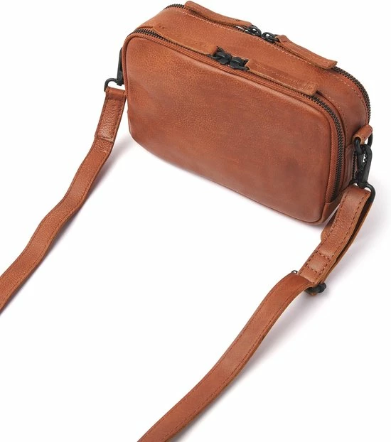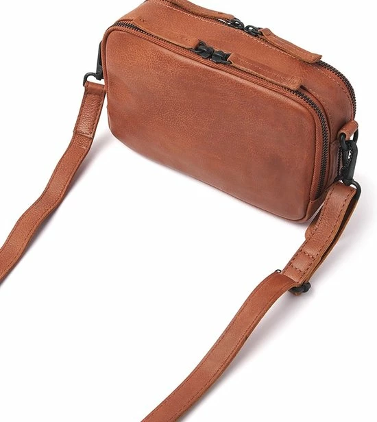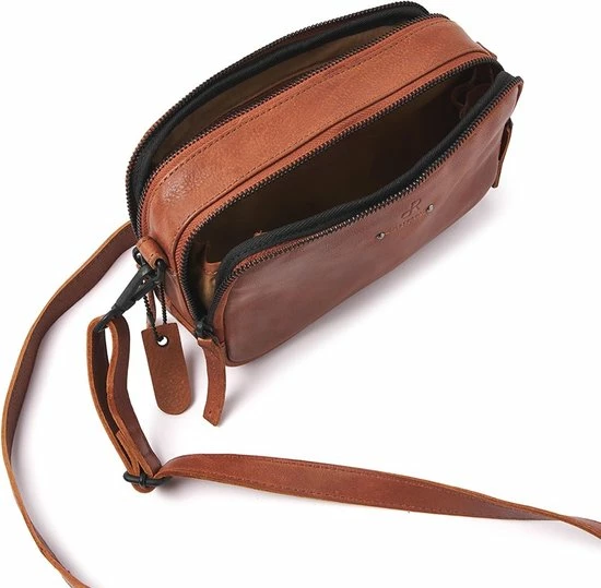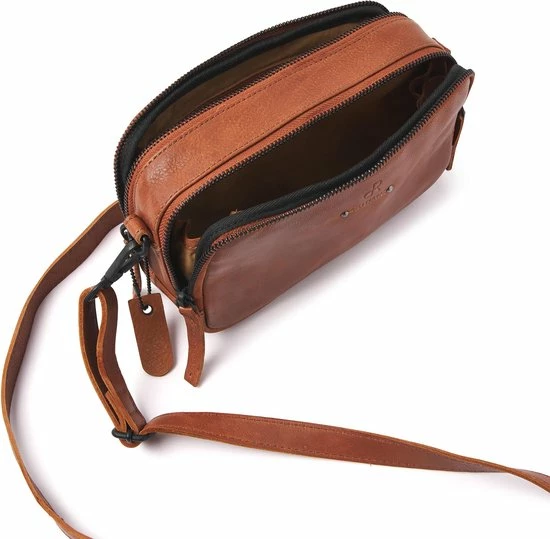 Deze fijne schoudertas is gemaakt van zacht rundleder, heeft een in lengte verstelbare en afneembare schouderband. De tas heeft twee opbergvakken welke met twee ritsen afsluitbaar zijn. Een rits kan naar links en de andere naar rechts, waardoor je de tas volledig open kunt krijgen. Het voorste vak heeft een speciaal vak voor je telefoon en in het achterste vak bevinden zich een ritsvak en sleutelhanger. Dit tasje is handig om mee te nemen tijdens een dagje weg.