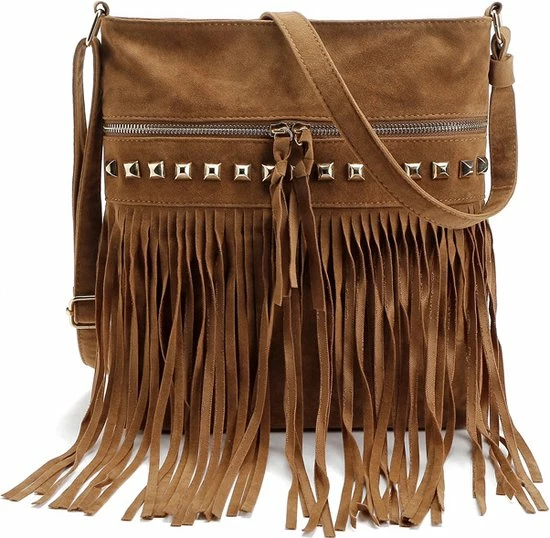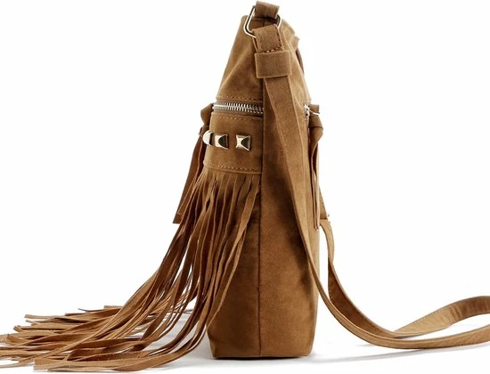 Een stoere suedelook schoudertas met gouden knopjes en accenten. Het hoofdvak bevat twee inschuifvakken, en een vak met een ritssluiting. Het voorvak is vrij ruim en hij heeft ook een achtervak.