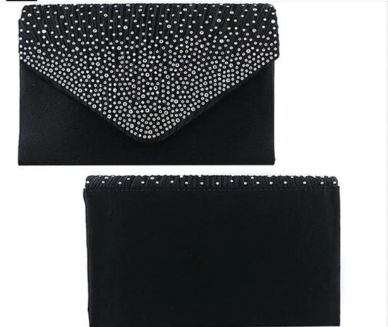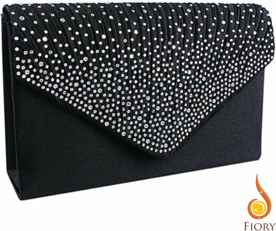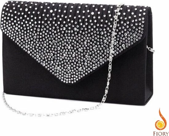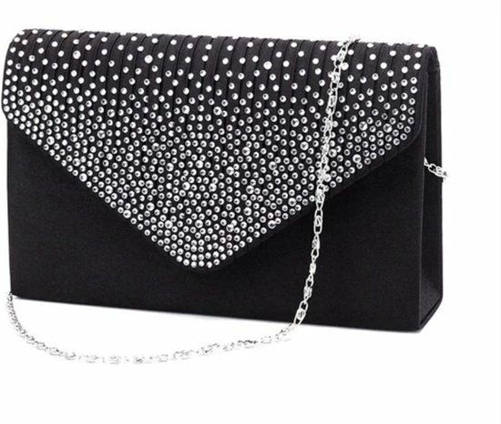 Deze tas is gemaakt van mooie satijne stof in het zwart. Waarbij er op de voorzijde van de tas nog strass steentjes bevestigd zijn.