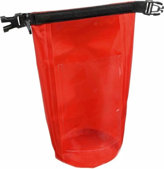 Waterdichte tas rood met sluitbuckle aan de zijkant. Inhoud: ca. 2 liter. Afmeting: 19 x 28 cm. Materiaal: kunststof. Deze waterdichte tas met zichtvenster houdt uw spullen droog op het strand of in het zwembad.
