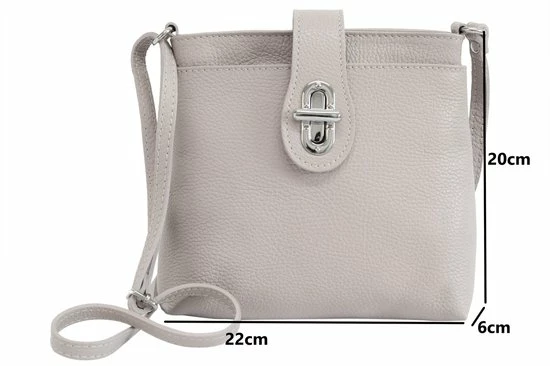 Italiaanse crossbody tas, schoudertas gemaakt van echt leer. Het leer is stevig en toch zacht. Deze tas heeft een groot hoofdvak met een rits, een klein ritsvak aan de binnenkant en een groot vak aan de voor- en achterkant. De twee compartimenten worden afgesloten met een extra draaislot, zodat de inhoud veilig opgeborgen kan worden. De trendy look en verfijnde lay-out maken deze tas een tas voor elke dag. Afmetingen van de tas is ca. 22 cm x 20 cm x 6 cm (L x H x B) Gewicht ca. 350 g, schouderband is verstelbaar van ca. 65 cm – 120 cm. Zeer goed vakmanschap, handgemaakt in ItaliΓ«.